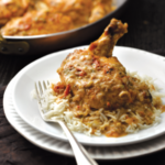 Pour over the stock or water. Place the chicken on top, skin side up. Season with salt. Drizzle the remaining ½ tablespoon oil over the chicken.